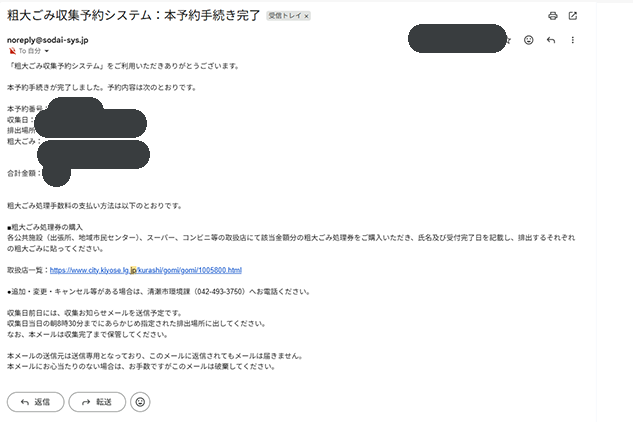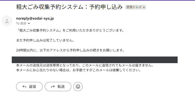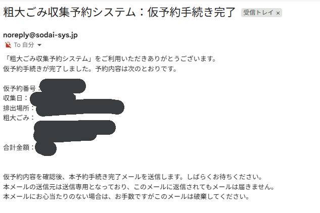 粗大ごみ収集申し込みした後、こういった仮予約手続完了メールが届きます。