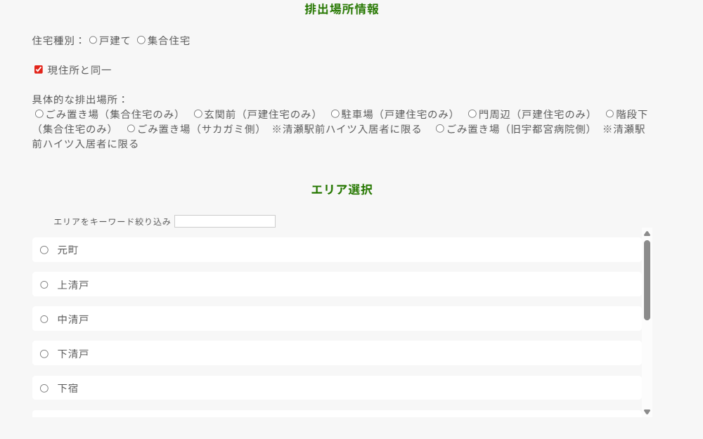 排出場所、エリアも、希望の場所のボタンをONにしましょう。