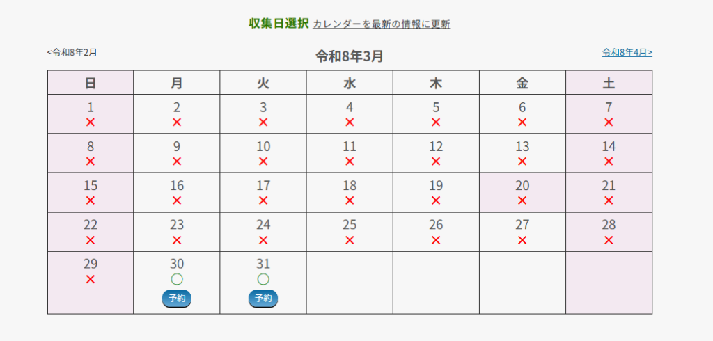 注意点として、品目に変更やキャンセルが発生した場合はネット上では変更できません。収集日の前日(土日祝の場合はその前の開庁日)までに環境課(042-493-3750)に電話する必要があります。
