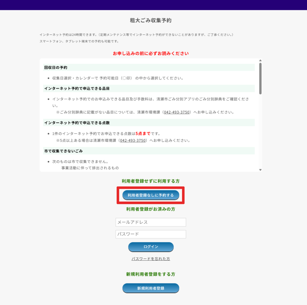 1. サイトにアクセスして、初回なら「利用者登録なしに予約する」を選択